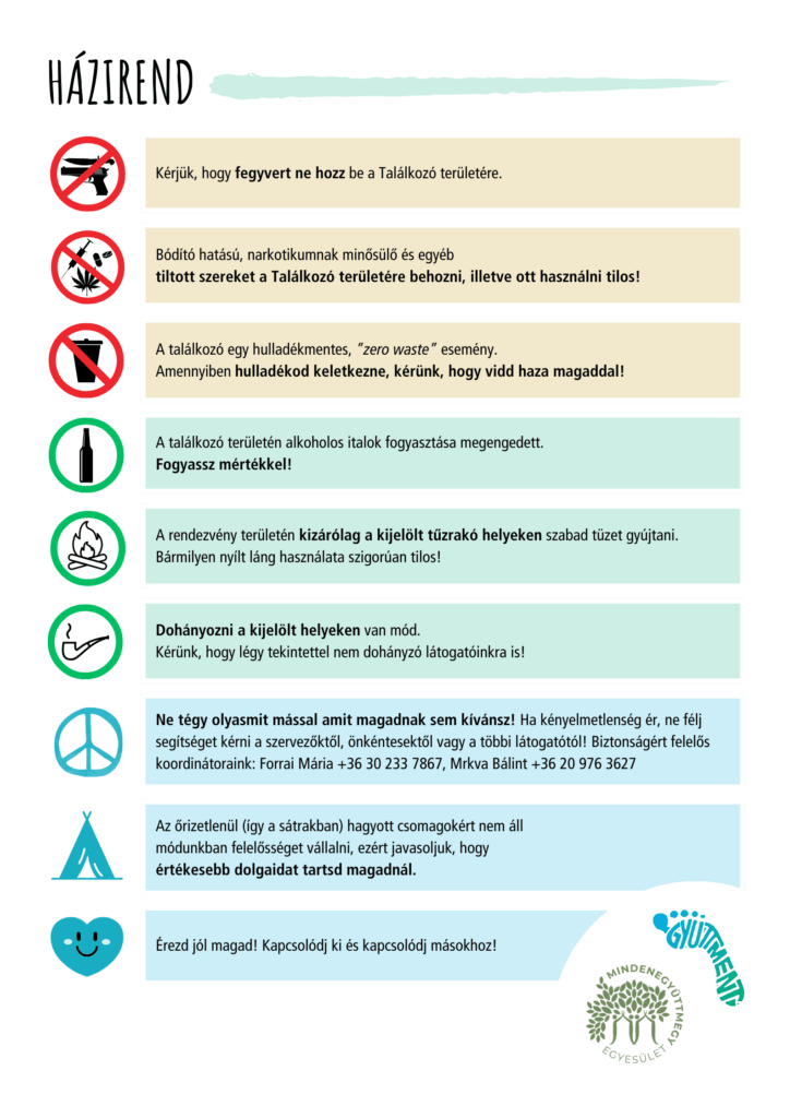 Kérjük, hogy az Általános Szerződési Feltételekben foglaltak mellett az alábbi szabályok betartásával is járulj hozzá a Gyüttment Találkozó területének megóvásához, illetve a rendezvény békés, konfliktus- és problémamentes lebonyolításához. A jelen szabályzatban meghatározottakon túlmenő kempinghasználati és parkolási rendről a Rendezvény területén kihelyezett tájékoztatókon olvashatsz.